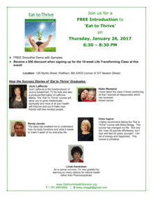 The summer Eat to Thrive course will be held every Wednesday from 6-9pm, May 31 through August 2. Optimum Health Solution is hosting a free introduction night Wednesday May 17, 6:30-8:30 at 126 Myrtle Street in Waltham, MA to acquaint you with the benefits of the Eat to Thrive course. Come to enjoy a free smoothie demo and snacks. You will get a taste for the class that will change your life. Eat to Thrive graduates Heike Westphal, Diane Sugrue, and Randy Jacobs will come to share their experiences in the 10-week course and beyond. Hear their stories of overcoming diseases, losing weight and finding a new meaning of health, and changing their life for the better and find out how you can do the same!