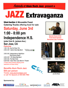 Featuring the musical talents of: Joe De Rose Trio (1:00 - 1:45) Santa Clara Big Band (2:00 - 2:45) Independent High & Alum Rock Alumni Band (3:00 - 3:45) 7th Street Big Band (4:00 - 4:45) The bad Ones (5:00 - 5:45) Alum Rock Jazz Band (6:30 - 8:00)