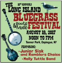 The 15th Annual Long Island Bluegrass & Roots Music Festival is 7 hours of continuous music in a beautiful setting on the Great South Bay in Tanner Park, Copiague, NY. This year's line-up is: JUNIOR SISK & RAMBLERS CHOICE THE MOLLY TUTTLE BAND Buddy Merriam & Back Roads Eastbound Freight Meadow Grass Cassandra House & Dave March Bob Westcott The Brigands Grand Folk Railroad The LI Bluegrass Festival Fiddle Kids