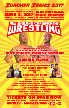 New England Championship Wrestling kicks off its Summer Series 2017 with a return to live action on Saturday night, June 3rd at the Americal Civic Center, 467 Main Street, Wakefield, MA with a 7 PM bell time.