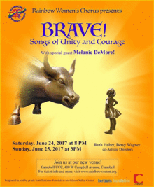 Join Rainbow Womens Chorus and friends as we celebrate our empowerment BRAVE! Songs of Unity and Courage. Performances are Saturday, June 24 at 7:30 PM and Sunday, June 25 at 3:00 PM. The concert will be at our new venue, Campbell United Church of Christ, 400 W. Campbell Avenue, in Campbell, one block east of the San Tomas Expressway. Our special guest, Melanie DeMore, is a dynamic singer, entertainer and activist. She will have you moving your whole body! Also, our resident composer, Ruth Huber, has composed a new song, inspired by recent marches and rallies.