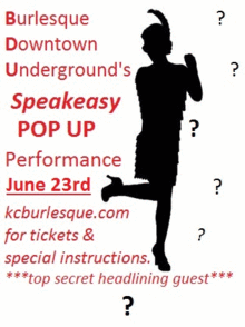 Kansas City's own Burlesque Downtown Underground is storming the city and taking a TBA stage! A secret location, time, and special guest performer all lead to a Burlesque Downtown Underground performance on Friday, June 23rd with a Pop Up Performance, Speakeasy Style! Along with an all-star line up of BDU's Luscious Ladies, this show will sell out!