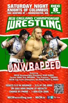 NECW presents UNWRAPPED, night 2 of a 2 night holiday spectacular, Sat night, Dec 8 at 7 PM at the Knights of Columbus, 582 Bedford St, Bridgewater, MA.