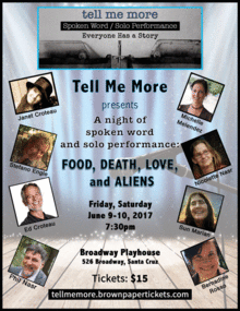 Tell Me More presents: Food, Death, Love and Aliens - a night of spoken world and solo performance. Prepare to be deeply moved, inspired - and to laugh until you cry.