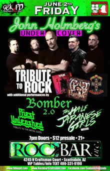 Join Rockbar inc. along with Holmberg's Morning Sickness on 98 KUPD as @John Holmberg hits the stage with Tribute to ROCK Holmberg's Under Cover with special guests Bomber 2.0 Priest Unleashed - A Tribute to The Metal Gods The Half-Japanese Girls - Weezer and Renegade Audio's DJ Michael Hagen OnThePatio 7pm Doors $12presale 21+ ViP Tables/Info TEXT 480-331-9190 www.RockbarScottsdale.com