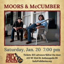 Saturday, January 20, 2018 at the Indy Folk Series When they met by chance ten years ago, James Moors and Kort McCumber felt like the universe was throwing them together for a reason. Like Simon & Garfunkel or Crosby, Stills and Nash, they deliver haunting songs about love and life with dazzling instrumentals and transcendent harmonies.