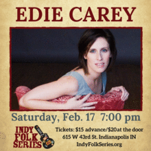 A returning favorite to the Indy Folk Series, Edie Carey is known for her unmistakable, soulful voice, her intelligent, heart-grabbing songs, but perhaps most especially for her warm, engaging presence on and off stage. As much a part of her show as the music itself, Careys wry and often self-mocking humor makes audiences feel as though they have just spent an evening with a very close friend. Carey has been singing at festivals, colleges, and listening rooms across the US, Canada and Europe since 1999, performing alongside Emmylou Harris, Lyle Lovett, Brandi Carlile, and Shawn Mullins, and has been a featured artist on NPRs Mountain Stage.