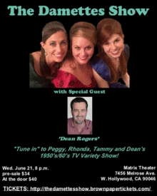 Straight from their exclusive engagement at the Tropicana Laughlin, watch Peggy, Rhonda and Tammy in The Damettes Show with special guest Dean Rogers as they coast into the Matrix Theatre in their Chevy Bel Air. Revel in the rock and roll revolution with music from The Chiffons to Patsy Cline to Frankie Valli and Elvis Presley all presented in the style of a 1950's/60's TV Variety Show! Join them as they bring to life some of our most iconic hits like Chapel of Love, Stand By Me, Crazy, Hound Dog, Stop in the Name of Love and many, many more. Starring: Megan Johnson Briones, Mindy Montavon, Tamara Philbrick and Aaron Jacobs.