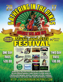 Gathering in the Pines First Annual Arts & Music Festival. The arts festival features a wide variety of artists works of pottery, photography, jewelry, paintings and other mediums.