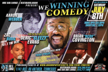 BeatsBarsLaughs presents - "We Winning" Comedy Show - Saturday, July 8, 2017 @ 9ine Bar\Lounge 1142 Bell Road, Antioch, TN. Headlined by Derrick "Sleezy" Evans, performing - Zacboog from 101.1, Eran Webber, hosted by Brian BCov Covington. Doors open at 6:30pm, show starts at 7:30pm.