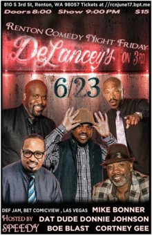 Once again DELANCEY'S on 3RD hosts a night of comedy and music! Boasting a full drink and bar menu, DeLancey's is Downtown Renton's #1 party spot! There is plenty of free parking downtown Renton.