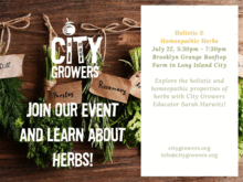 *This time the workshop is just for adults! About Sarah Hurwitz Sarah Hurwitz is a Farm Educator with City Growers. She happily teaches (along with the whole CG team) thousands of NYC students each month all about where our food comes from, why it matters, and how they can positively impact our current food system. She comes to CG after spending two years in North Carolina working as an herbalist and farm manager. She believes that healing is a personal process that we must embrace. Herbs encourage us to be participants in our healing journey and she hopes to empower you on yours.
