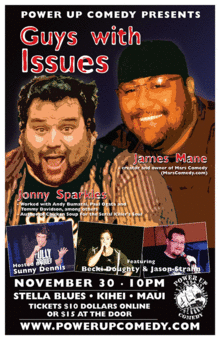 James Mane is the creator and owner of Mars Comedy (MarsComedy.com), and host of Guys With Issues (a Hawaii based comedy podcast) The Guys with issues comedy show will be hosted by Sunny Dennis and will features Jason Strahn and Becky Doughty.