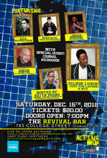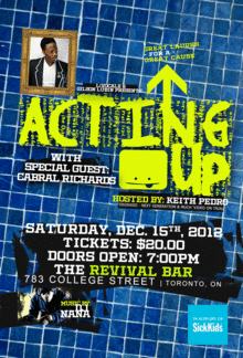Acting Up a comedy show worth experiencing has put together an all-star comedic line up and other special guests. The other great treat about the Acting Up comedy experience is proceeds will go to SickKids' Burns and Plastics Unit. Come have a hoot December 15th, 2012 at Revival 783 College Street. Doors open at 7:00pm