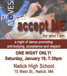 Project Moves brings the message of anti-bullying and acceptance to Natick High School. Inspired by the work of Kevin Epling, who lost his son Matt to bullycide in 2002, ...accept ME had its Boston Premier April 1 & 2, 2011 to full houses and standing ovations both evenings. ...accept ME, featuring dancers age 6 to 18, uses dance, spoken word, and visual media to promote acceptance and open anti-bullying conversation. You will laugh, cry, and leave the theatre celebrating the uniqueness of every human being.