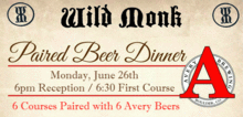 Wild Monk welcomes Avery Brewing Company on Monday, June 26th for a 6 Couese Beer Dinner 6pm Reception / 6:30 First Course