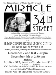 A little girl discovers dreams do come true if you really believe. Six-year-old Susan has doubts about childhood's most enduring miracle - Santa Claus. Her mother told her the "secret" about Santa a long time ago, so Susan doesn't expect to receive the most important gifts on her Christmas list. But after meeting a special department store Santa who's convinced he's the real thing, Susan is given the most precious gift of all - something to believe in. Presented by the Hicksville Village Players Adapted by Mountain Community Theater, from the novel by Valentine Davies Based upon the Twentieth Century Fox motion picture, Miracle on 34th Street Produced by special arrangement with THE DRAMATIC PUBLISHING COMPANY of Woodstock, Illinois at the beautiful HUBER OPERA HOUSE AND CIVIC CENTER in downtown Hicksville The first production featuring the Huber's new sound system!