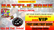 TOMMY THE CLOWN PRESENT BATTLE ZONE 25TH YEAR CONCLUSION OCTOBER 7th COME WATCH TOMMYS CREW THE T-SQUAD TAKE ON BOOMER AND THE BOOM SQUAD WITH THIS HEAD TO HEAD INTENSE HIGH ENERGY AGGRESSIVE DANCE BATTLE WHERE YOU CAN BE THE JUDGE!!! TICKETS ARE ONLY $20 IN ADVANCE OR $25 AT THE DOOR ON A FIRST COME FIRST BASIS THIS ALL GOES DOWN WHERE BATTLE ZONE FIRST STARTED, LOS ANGELES SOUTHWEST COLLEGE 1600 W. IMPERIAL HWY LA. CA. 90047