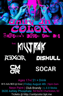 From the creators of ColorStorm & Electric FOAM, Charleston's largest paint rave Unity in COLOR hits this summer. Paint guns & 300 gallons of tub washable neon paint will be set center stage & unleashed into the crowd. Schools out so this will be 1 of the largest paint rave a to date. Invite your friends to the page & watch the hype!
