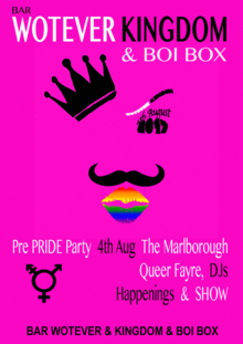 Queer Fayre, Happenings & DJs 5pm - 2am FREE Entry Queer Fayre: Zines, Badges & Queer stuff for sale 5pm - 8pm DJs: DJ Jo Bunny, Vickety Lester & Tesla Girls 7pm - 2am Happenings: A Variety of Drag Kings & Friends, on tables in various spaces when you least expect it All Night Long!