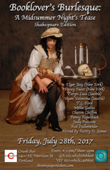 Performers for our Shakespeare Edition of Booklover's Burlesque include visiting performers from New York City Fancy Feast and Tiger Bay, visiting performers from Seattle Vixen Valentine and Taryn Luce, and local performers T.L. Ford, Chaton Chiffon, Millie Gables, Judy Patootie & Rod Fullenwider (duet), and Penny Paperback. Hosted by Rarity St. James.