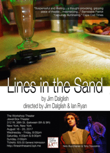 "'Lines In The Sand' by Jim Dalglish is a real thriller... It is a production thrill in the quality of the on-stage work at all levels. This very fine production is edgy, atmospheric and gripping. You won't have seen a play quite like this before under the banner of lgbt theatre and you won't wonder why it is such a worthy inclusion in the programme it is so well done. - International Dublin Gay Theatre Festival Review