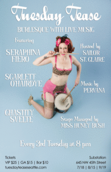 Tuesday Tease is Seattle's only monthly burlesque revue with live musical accompaniment. The show brings together the musical stylings of Pervana and a rotating cast of Seattle burlesque artists to spice up your Tuesday nights with some tease and tunes. Our featured dancers bring a blend of neo and classic burlesque to showcase their stylistic flexibility -- and the band's! Pervana covers everything from jazz and blues to punk and pop and anything in between. You can catch Tuesday Tease every 3rd Tuesday at Substation!