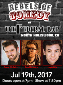 It's Rebels of Comedy at the Federal Bar in North Hollywood. Come out and see a night of live comedy, featuring an awesome lineup of professional features and headliner comedians. Hosted by Conor McGuire with Ben Ellenberg, Hugh Fink
