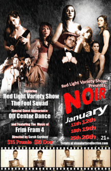 In conjunction with the hilarious & side-splitting comedy duo The Fool Squad, the sultry sirens of Off Center Dance, and the ever harmonious panty-dropping Frim Fram Four, Red Light Variety Show presents a night of detectives, murder, femme fatales, clowns, acrobatics, delicious eye-candy, and luscious intrigue. Under the direction of Sarah Gardner and done in the style of Film Noir, the show harkens back to a time of mystery and sensuality when even the good were bad and the bad were just a few drinks away from being good. ------------------------------------------------ January 11- 12 - 18 - 19 - 25 - 26 Doors at 8pm - Show 9pm $15 in advance $20 at the door 21+ ONLY Valid ID required