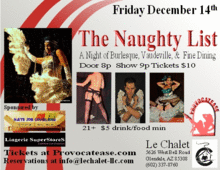 Provocatease returns to Le Chalet in Glendale, AZ, on Friday December 14th for a special, one night only, holiday burlesque dinner theater spectacular called The Naughty List. This intimate show will be held in a quaint French restaurant where guests will have the opportunity to dine on authentic French cuisine as they are teased and titillated by the sexy starlets of Provocatease. Guests will undoubtedly end up on the naughty list after a sensuous night of erotic dancers, spine-tingling magic, amazing food and wine, risque comedy and more. Provocatease is a talented and diverse group of artists that have been performing live since 2008. The festivities will be hosted by the ever-charming Handsome Ron who will lead the parade of dancing burlesque dolls, frisky reindeer, singing vixens and a special appearance by The Big Man in Red and the Ho-Ho-Ho's. Expect the unexpected from your favorite Provocatease players including the salacious Madam C, the red hot Scarlet Fever, The Amazing Spinney plus a guest performance that is not to be missed. Seating is very limited, so get your spot on The Naughty List before it fills up. Presale tickets are only $10 online