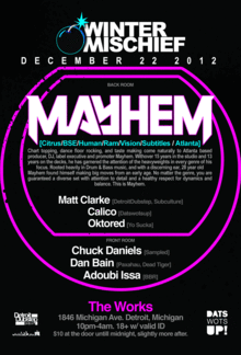 Mayhem (Atlanta, GA) Chart topping, dance floor rocking, and taste making come naturally to Atlanta based producer, DJ, label executive and promoter Mayhem. With over 15 years in the studio and 13 years on the decks, he has garnered the attention of the heavyweights in every genre of his focus. Rooted heavily in Drum & Bass music, and with a discerning ear, 28 year old Mayhem found himself making big moves from an early age. From releasing records for Andy C, TeeBee, Dieselboy, Noisia, and Black Sun Empire to DJing across the world for massive crowds in Japan, Australia, New Zealand, Europe and beyond; he has warranted a reputation for diversity and quality control. Collaborating with and developing artists such as Noisia, Le Castle Vania, Phace, EvolIntent, Sinthetix, Gein and Gridlok amongst many others, his production soared to new heights with "Exodus (featuring the legendary KRS-1)", "Moonway Renegade", and "Choke" with Noisia. Boundless inspiration pushed Mayhem to pursue Dubstep in it's formidable years,immediately signing with the reputable Subway Records, as well as Indie/Electro under the moniker Rrrump. As of late his focus has been brought back to home on the forefront a movement combining southern Rap music with Dubstep collaborating with long time friend Heroes + Villains. His club nights Transit, Fuck Yesss, Heavy, Tambor Y Bajo, Atlanta Dubstep and Haute Mess have helped reshape Atlanta's nightlife. No matter the genre, you are guaranteed a diverse set with attention to detail and a healthy respect for dynamics and balance. This is Mayhem.