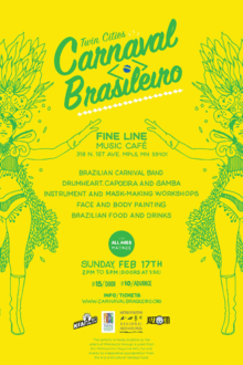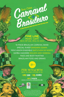 3 shows in 3 days: 9pm to 2am on Friday and Saturday, plus a 2pm - 5pm all-ages family matinee on Sunday afternoon! $15 in advance/$20 at the door for the evening shows, $10 in advance/$15 at the door for the afternoon matinee. Featuring over 75 performers!!! Beira Mar Brasil Carnival Band, Batucada Do Norte and Drumheart percussion ensembles, professional samba dancers Edilson Lima and Vanessa Luiz, face and body painting, Magician Danny Lord, Brazilian food and drinks (caipirinhas and guaranĂ¡!), and much more!!!