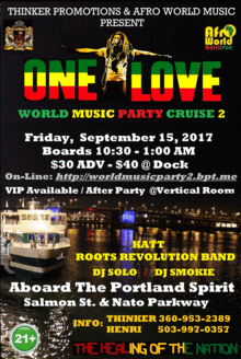 |  | EventONE LOVE World-Music Party Cruise 2Cruise the river and party aboard the Portland Spirit! Enjoy the Northwest's best Reggae band, ROOTS REVOLUTION featuring KATT, the golden voice from Jamaica. We will also feature top Afro-Caribbean DJs, (Solo, Dullah and Smokie Dan)
