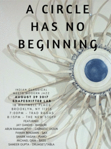 "A Circle Has No Beginning" by Tabla and Drumset virtuoso Sameer Gupta, features a stellar lineup of musicians who specialize in the worlds of Raga-inspired and Modern Jazz music. This ensemble together creates a truly remarkable modern musical journey. With repertoire drawing firmly from Indian Classical influence, as well as strong Modern Jazz improvisational roots - their creative energy and original sound elevates the audience through crossing the traditions and borders of music from India and America.