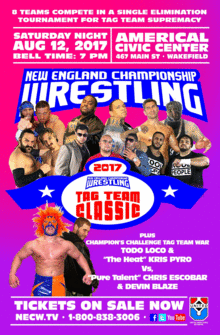 New England Championship Wrestling presents the 2017 NECW Tag Team Classicas the company returns to live action on Saturday night, August12th at the Americal Civic Center, 467 Main Street, Wakefield, MA with a 7 PM bell time.