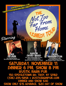 The Not to Far from Home Comedy Tour is coming to The Rustic Barn! On November 11th Comedians Aaron David Ward, Dan Geurin and Deric Harrington will be making us laugh upstairs in our banquet room. Tickets are available online or in house for $15 in advance $20 day of for the show only (8pm). We are selling a limited amount of $40 tickets that include a buffet dinner, soft drink/coffee and prefered seating (6pm).