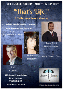 Take a stroll down memory lane with "That's Life!" A Tribute to Frank Sinatra and enjoy some music from one of the most popular and influential musical artist of the 20th Century.