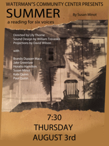 Come to a staged reading of "Summer" by Susan Minot, a short piece for six voices that grew out of writing her new play, On Island. Inspired by North Haven life, this remarkable project is in development.