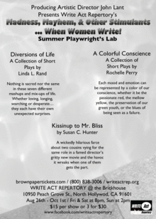 MADNESS, MAYHEM, and OTHER STIMULANTS When Women Write! Summer Playwrights Lab 2017 Write Act Repertorys annual women's playwrights returns in our new home spotlighting three prominent Los Angeles playwrights. Write Act Rep's Spotlight Series provides an opportunity for Write Act Rep artists-in-residence featuring a principal performer's written word, with the support of fellow Write Act members. Write Act Rep picks a writer's body of work as a focus for our playwriting groups we work with here. In the past, Write Act Rep worked with members of Los Angeles Playwrights Group, ALAP, At-Rise Playwrights and Women Inventing Theatre.