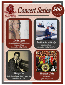 This year, the Mitchell Opera House and Southern Indiana LIVE on Stage have teamed up again to provide four special shows as part of a concert series. Because of the generosity of local sponsors, season ticket holders will be able to enjoy the four shows in the Opera House concert series along with the four shows in the Southern Indiana Live on Stage concert series for an incredible price of $60. The first show of the Mitchell Opera House series will be Tayla Lynn, Lorette Lynns granddaughter. She will be performing live country music at the Mitchell Opera House on September 9th at 7:00 p.m.! Tayla Lynn is a southern girl who grew up in the heart of Tennessee, and her country bloodlines are undeniable. Her grandmother is country-music legend, Loretta Lynn, and her father, Ernie, sand and played guitar in Lorettas band. I cant remember a time that I wasnt in the wings of some town somewhere, watching my memaw and my daddy on stage, recalls Tayla. Tayla has toured with Loretta, opening her shows over the years. Tayla performs a variety of her own musical as well as singing her memaw, Loretta Lynns songs. The second Opera House show will be Ladies for Liberty on November 11, 2017. The show will start with local school teacher, Angie Tillman, speaking about World War II at 6:30. The Ladies for Liberty will begin at 7:00 p.m. Ladies for Liberty is a singing group dedicated to performing the Andrews Sisters style of music through their own rendition of vocals, costumes, hairstyles and spirit of patriotism in the 1940s. The third Opera House show will include Terry Lee & The Rockaboogie Band on March 9, 2018 at 7 p.m. Terry Lee & The Rockaboogie Band is a high energy, first class show band built around the lightning fast piano pumpin, Rockaboogie playing of London England's Terry Lee. Performing a large selection of popular hits from the 50's and 60's Terry Lee and the Rockaboogie Band will keep the dancers on their toes and everyone else fully involved with the action on stage! The final show of the Mitchell Opera House concert series will be Twisted Gold on April 21, 2018 at 7:00 p.m. This high energy group performs some of our favorites from the 60s. Artists honored by the group include the Mamas and the Papas, Tommy James & the Shondells, Strawberry Alarm Clock, Steppenwolf, The Doors, The Bee Gees, The Bryds, The Kinks, The Rascals, Buffalo Springfield, Three Dog Night, the Beetles and many many more. Come dressed in your favorite 60s attire! If you purchase one of the season passes to the awesome list of performances above, you will also be able to use it for the 4 shows in the Soutern Indiana LIVE on Stage series. The series includes the Beatles Tribute Band Britt Beat on September 30th, country singers Larry Galtin and Billy Dean on October 28th, the IU acupella group Another Round on December 9th, and the IU group the Singing Hoosiers on March 24th. All Southern Indiana Live on Stage shows will start at 7:30.