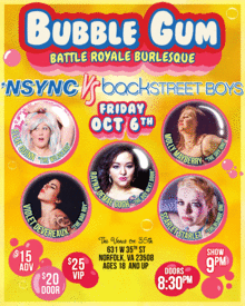 In the 90's the media pitted two of America's hottest music groups against one another in an epic clash for pop culture supremacy. To celebrate Ellie Quinn's birthday, we are reigniting that battle burlesque style with Bubble Gum Battle Royale: N Sync vs. Backstreet Boys.