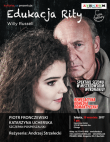 EDUKACJA RITY to kultowa sztuka angielskiego autora Willyego Russella, w adaptacji wybitnego rezysera i aktora teatralnego i filmowego, Andrzeja Strzeleckiego. To znakomity, zabawny i wzruszajacy spektakl dla tych, którzy zadaja sobie pytanie, czy w zyciu warto zaczynac wszystko od poczatku. W tytulowej roli Rity jedna z najbardziej obiecujacych polskich aktorek mlodego pokolenia, Katarzyna Ucherska (Barwy szczescia, M jak milosc, Na dobre i na zle, Ojciec Mateusz, Klan), a w roli uniwersyteckiego profesora, jeden z najwybitniejszych polskich aktorow, znakomity Piotr Fronczewski. Duet ten bedziemy mogli podziwiac we wzruszajacej komedii, opowiadajacej historie przyjazni Franka, uniwersyteckiego profesora, alkoholika i Rity, jego studentki, ambitnej fryzjerki, sluchaczki niedzielnego uniwersytetu. Ona, wulkan energii, entuzjazmu i mlodzieczej otwartosci, mloda fryzjerka z niezamoznej rodziny, marzy o wyrwaniu sie do lepszego swiata i dlatego zostaje studentka uniwersytetu otwartego. Tam trafia na Niego, naduzywajcego alkoholu, doswiadczonego profesora literatury. On, niespelniony poeta, zamkniety w sobie, zgorzknialy i zrezygnowany. Dzien, w którym Rita pojawia sie w gabinecie Franka, w magiczny sposob zmienia ich oboje. Rodzi sie przyjazn, moze milosc, odrobina pozadania. Pelna elektryzujacych momentów, zwrotów akcji, humoru i byskotliwych bon motów sztuka, w rekach rezysera z poczuciem humoru i w wykonaniu doborowej obsady aktorskiej, staje sie madra i zabawna przypowiescia o odwiecznych ludzkich pragnieniach wiary w drugiego czlowieka, bawi, wzrusza i sklania do refleksji.