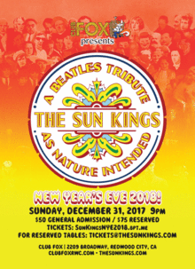 The Sun Kings head to their favorite spot on the peninsula, Club Fox, Redwood City to celebrate the New Year! The evening will be full of dancing, singing, and libation as you listen to your favorite songs performed by a world-class tribute to The Beatles.