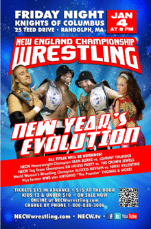 New Englanmd Championship Wrestling kicks off 2013 with NEW YEAR'S EVOLUTION, Friday Night, January 4, 2013 with an 8 PM bell time at the Knights of Columbus, 25 Teed Drive, Randolph, MA.