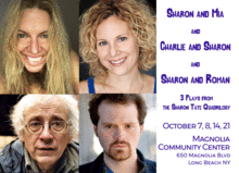 MIA AND SHARON is created by Jen Danby and Jessica Smith, and CHARLIE AND SHARON and SHARON AND ROMAN is created by Jen Danby and Daniel Delano. All three are directed by Austin Pendleton. Cast: Jen Danby as Sharon Tate; Daniel Delano as Charlie Manson and Roman Polanski; and Jessica Smith as Mia Farrow.