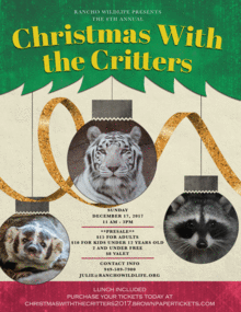 Join us for our 8th annual Christmas with the Critters for a fun festive day! The children will enjoy crafts, holiday music, bounce house, Santa, watching the animals opening their Christmas presents and listening to keeper talks, while the parents can enjoy holiday shopping, silent auction, lunch and beverages.