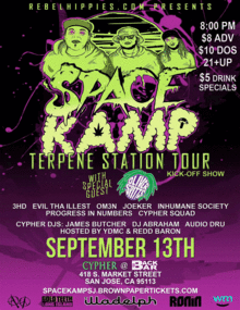 Headlining their 1st US tour, Space Kamp heads out the road to support their debut album Terpene Station. Roll up something sticky and come out to say HIGH to the stoniest group in the galaxy.