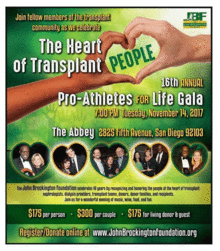 The John Brockington Foundations annual gala to celebrate organ and tissue donation. Wine, food, and fun for JBF supporters, celebrity athletes, the public, and members of the kidney and transplant communities of San Diego. Proceeds go to JBFs patient education and patient assistance funds.