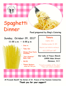 A Spaghetti Dinner is being held to benefit the Sisters of St. Francis (Williamsville) on Sunday, October 29, 2017 from 11:00 a.m. till 6 pm at Our Lady of Peace, 10950 Main Street, Clarence. Tickets will be $10 for adults and $5 for children under 10. Take-outs will also be available. Enjoy door prizes, theme baskets, auctions and the ever-popular Nun-Sweeter Bake Sale. For additional information, please call 632-2155, ext. 687.