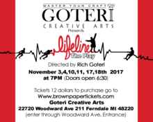 The play Lifeline is a series of six comedic scenes. The play is directed by Rich Goteri. It stars Montie Brown, Hobart Reynolds, Carol Brown,Bryan Sawyer, Michael Fish, Phil Elam, and Tony Minicilli.